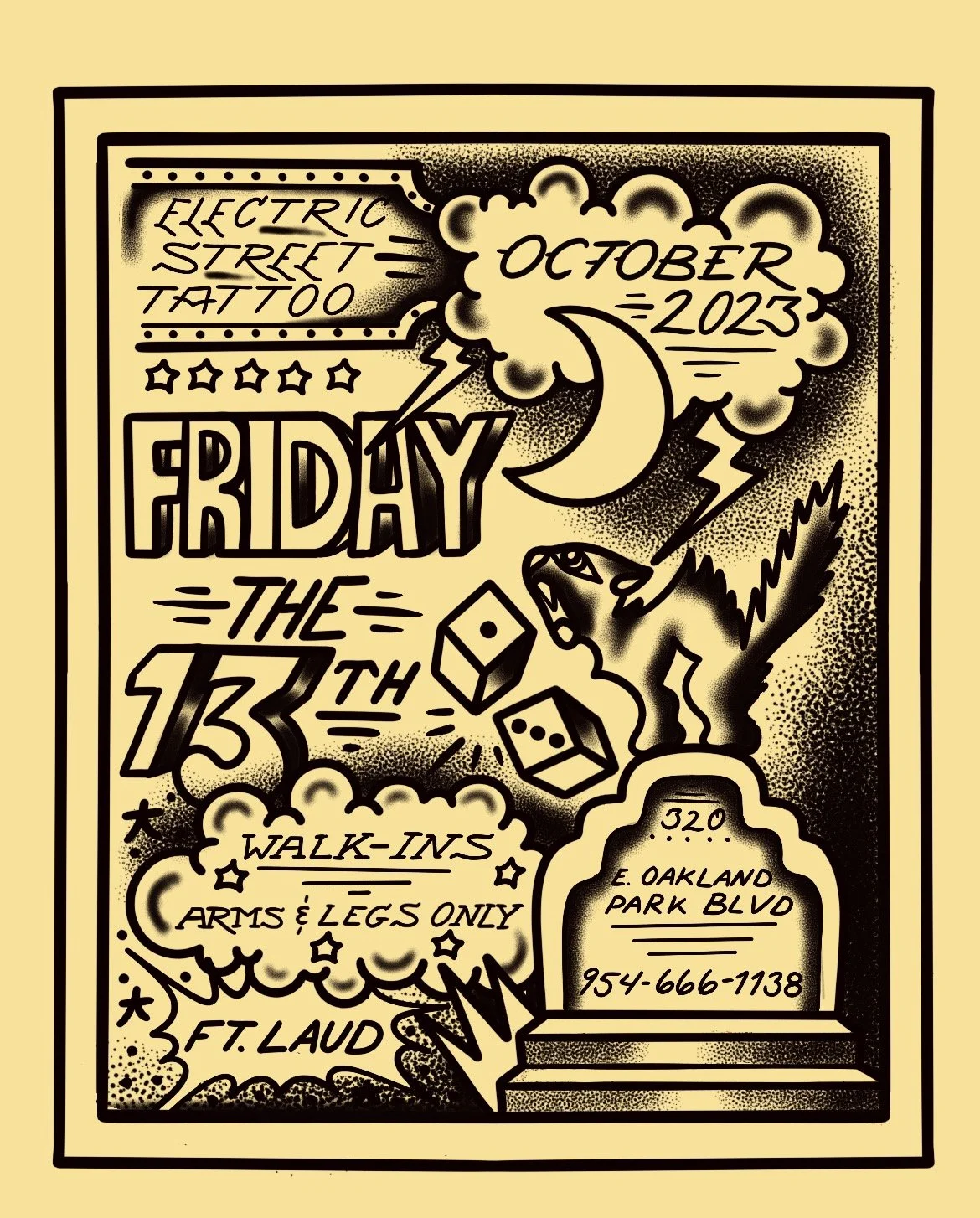 Important to note we will not be accepting appointments for this day, WALK-INS only and all Friday the 13th tattoos will be handled on a first come first serve basis so don't let superstition hold you back; embrace the tradition of Friday the 13th tattoos at Electric Street Tattoo. Whether you're marking this unique date for the first time or continuing a cherished tradition, we're here to make it unforgettable.